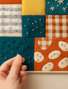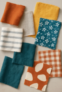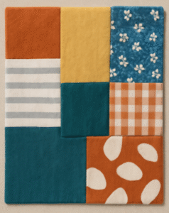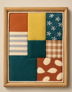 - Lay out the fabric pieces on a flat surface. Experiment with the arrangement until you’re happy with how the fabrics look together. You can arrange them in a grid, stripes, abstract patterns, or any layout that fits your vision.