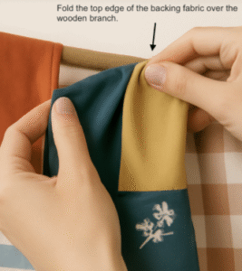 - Once the fabric pieces are securely glued and the art is dry, fold the top edge of the backing fabric over the wooden dowel or branch.